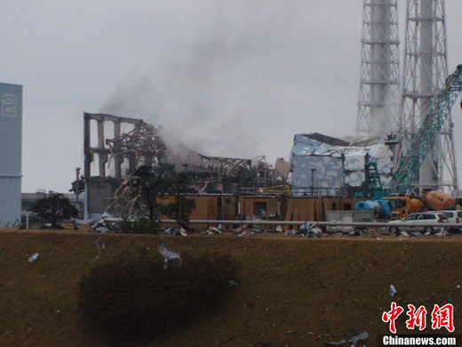 3月21日,東京電力公司公布的福島第一核電站3號(hào)反應(yīng)堆冒煙照片。當(dāng)天,東京電力公司宣布,下午3點(diǎn)55分前后,福島第一核電站3號(hào)反應(yīng)堆所在建筑物的東南側(cè)冒出灰煙,但是沒有聽到爆炸聲。