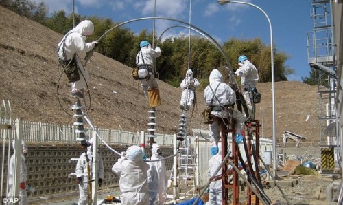 工作人員正在室外修復(fù)3號(hào)4號(hào)機(jī)組的供電設(shè)施