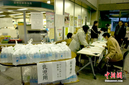 24日,由于東京部分自來水中檢測出的放射性碘超過嬰兒攝取上限,都政府開始向有嬰兒家庭發(fā)放共計(jì)24萬瓶飲用水。圖為東京都港區(qū)政府向有嬰兒家庭發(fā)放飲用水。中新社發(fā) 孫冉 攝
