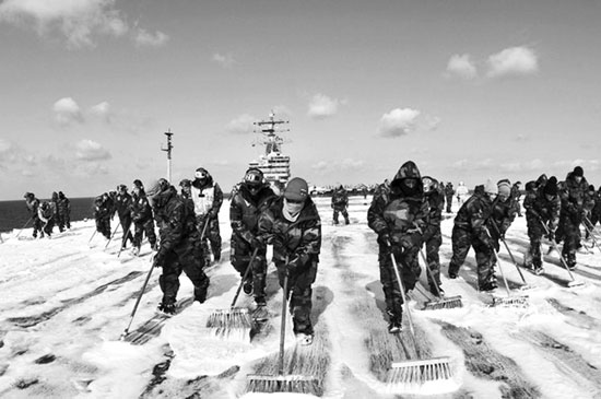 美國士兵對里根號航空母艦進(jìn)行清理作業(yè)