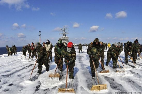 ·美軍士兵給“里根”號(hào)航母“洗澡”消除核污染