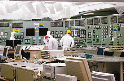 福島核電站的控制室在地震后嚴(yán)重?fù)p毀,天花板剝落,員工穿保護(hù)衣?lián)屝藿M件。