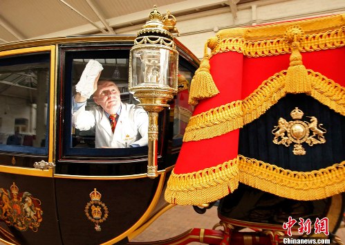 目前,威廉王子的婚禮正在有條不紊的籌備中。圖為工作人員擦拭將威廉王子大婚時使用的馬車。