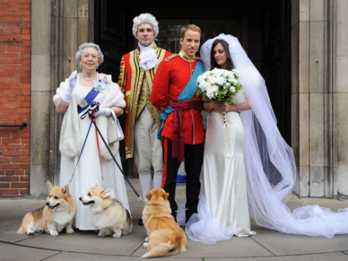 據(jù)報道,當(dāng)天一架華麗的馬車載著身著盛裝的“英國女王”、“威廉王子”和他的“準(zhǔn)王妃凱特”,現(xiàn)身倫敦市中心的皮卡迪利廣場(Piccadilly Circus ),立刻引起了周圍群眾的關(guān)注。只見在“皇家隨從”的護(hù)衛(wèi)下,神似“本尊”的三人在街頭行走,并在教堂前擺出姿勢,供圍觀者拍照留念!坝酢边牽著三只小狗,就像真正的女王一樣。