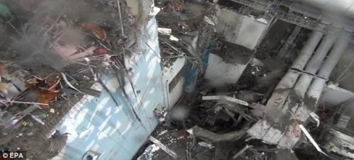 3月24日,從空中拍攝的圖片顯示了福島核電站四號機(jī)組嚴(yán)重?fù)p毀的內(nèi)部