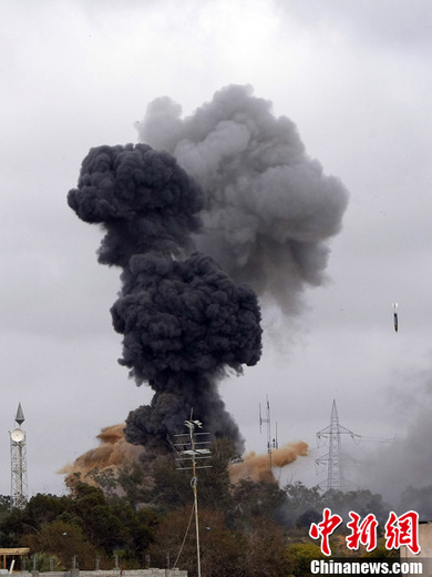 3月29日,利比亞首都的黎波里,利比亞領(lǐng)導(dǎo)人卡扎菲住所附近發(fā)生多起爆炸。圖為駐利比亞記者拍攝到導(dǎo)彈落下瞬間。