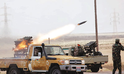 利比亞叛軍向政府軍發(fā)射火箭彈。