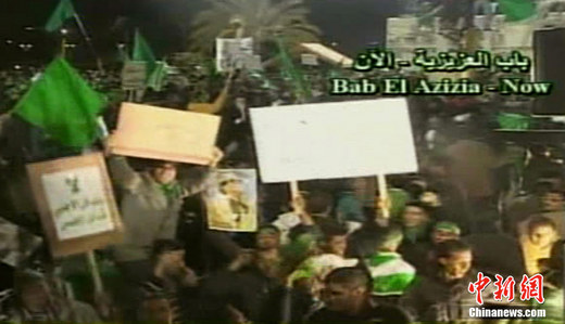 當?shù)貢r間3月22日晚,多國部隊對利比亞發(fā)動19日以來的第4輪空襲。22日深夜,利比亞領(lǐng)導(dǎo)人卡扎菲站在他被導(dǎo)彈襲擊官邸的陽臺上向大批支持者發(fā)表演,指責西方國家對利比亞發(fā)動的軍事行動是“十字軍國家對伊斯蘭國家發(fā)動的新十字軍東征”,并且表示他和他的支持者將在對反叛武裝和多國部隊的戰(zhàn)斗中奮戰(zhàn)到底,取得最后的勝利。圖為利比亞國家電視臺的截圖。