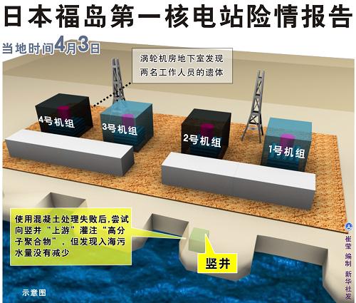 東京電力公司2日發(fā)現(xiàn),福島第一核電站2號機(jī)組取水口附近電纜豎井側(cè)壁有一處裂縫,高放射性污水從這里直流入海。東電當(dāng)天向豎井內(nèi)灌注混凝土,希望堵塞裂縫,但努力以失敗告終,污水仍源源不斷流入海中。3日,東電嘗試向豎井“上游”灌注“高分子聚合物”。這種物質(zhì)吸水后,體積可膨脹50倍,經(jīng)過水泥加固后,可用于封堵污水。但有關(guān)人員進(jìn)行了這一嘗試后發(fā)現(xiàn),流入海水中的污水量并沒有減少。