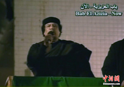 當(dāng)?shù)貢r間3月22日晚,多國部隊對利比亞發(fā)動19日以來的第4輪空襲。22日深夜,利比亞領(lǐng)導(dǎo)人卡扎菲站在他被導(dǎo)彈襲擊官邸的陽臺上向大批支持者發(fā)表演,指責(zé)西方國家對利比亞發(fā)動的軍事行動是“十字軍國家對伊斯蘭國家發(fā)動的新十字軍東征”,并且表示他和他的支持者將在對反叛武裝和多國部隊的戰(zhàn)斗中奮戰(zhàn)到底,取得最后的勝利。圖為利比亞國家電視臺的截圖。