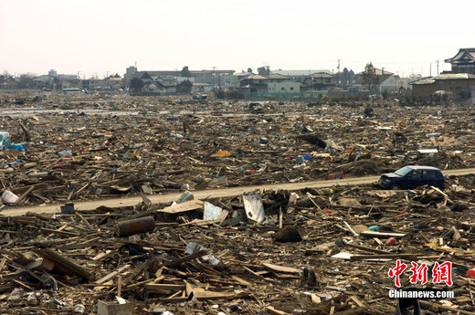日本地震過去兩周多,被海嘯傾襲后的災(zāi)區(qū)景象依舊。據(jù)悉,清理海嘯造成的廢墟要花費三到五個月的時間。圖為宮城縣名取市附近的景象。中新社發(fā) 孫冉 攝