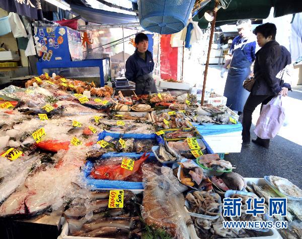 4月5日,賣(mài)家在日本首都東京一家海鮮攤上招攬顧客。日本茨城縣漁業(yè)協(xié)會(huì)5日宣布,從4日在北茨城市附近海域捕撈的玉筋魚(yú)幼魚(yú)體內(nèi)檢測(cè)出放射性銫達(dá)到每千克526貝克勒爾,超過(guò)食品衛(wèi)生法放射物暫定標(biāo)準(zhǔn)值設(shè)定的每千克500貝克勒爾。這是首次從魚(yú)類體內(nèi)檢測(cè)出放射性物質(zhì)超標(biāo)。新華社/法新