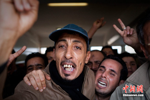 2011年3月19日,利比亞東部城市班加西一所醫(yī)院附近,一名男子激烈抗議空襲導(dǎo)致他的家人遇難。