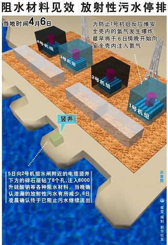 東京電力公司2日發(fā)現高放射性的污水從2號機組水閘附近電纜豎井的裂縫中流入海中,灌注混凝土以及吸水膨脹的高分子材料等封堵方法都未能奏效。5日,東京電力公司在電纜豎井下方碎石層中開鑿8個孔,注入6000升俗稱“水玻璃”的硅酸鈉等各種阻水材料,當晚確認泄漏的放射性污水量減少,6日早晨確認污水已停止外泄。