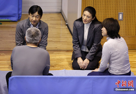 日本皇太子德仁6日下午偕同雅子妃赴東京都調(diào)布市的味之素體育館,慰問震災(zāi)避難災(zāi)民。