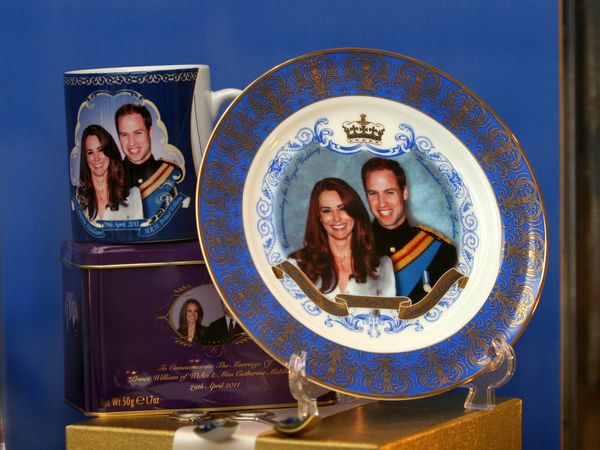 這是4月3日在英國(guó)首都倫敦一個(gè)禮品商店拍攝的威廉王子婚禮的紀(jì)念品。英國(guó)威廉王子與未婚妻凱特·米德爾頓定于4月29日舉行婚禮,預(yù)計(jì)將有數(shù)十萬(wàn)英國(guó)民眾在倫敦街頭舉行慶;顒(dòng),全球?qū)⒂谐^(guò)10億電視觀眾收看婚禮盛況。新華社發(fā)(高塔姆攝)