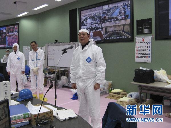 這張日本經(jīng)濟(jì)產(chǎn)業(yè)省4月9日提供的照片顯示,日本經(jīng)濟(jì)產(chǎn)業(yè)大臣海江田萬里(右)當(dāng)天在福島第一核電站視察時(shí)向東京電力公司員工發(fā)表講話。新華社/路透
