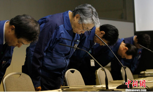 2011年3月28日,東京,東京電力公司召開新聞發(fā)布會(huì),通報(bào)福島核電站最新輻射情況,公司高管就“福島核電站積水輻射超標(biāo)數(shù)值錯(cuò)誤”的問題,向民眾鞠躬道歉。