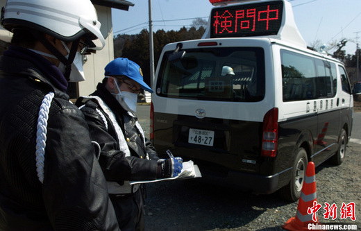 3月30日,記者駕車(chē)準(zhǔn)備前往距離福島第一核電站30公里的南相馬市。剛一進(jìn)入南相馬市境內(nèi),就被3名全副武裝的警察攔了下來(lái)。這3名警察來(lái)自廣島,他們奉命在此提醒每一位路過(guò)的車(chē)輛,由此進(jìn)入30公里半徑范圍,有核輻射的可能。據(jù)警察介紹,在30公里半徑范圍有數(shù)個(gè)這樣的關(guān)卡,而在20公里半徑,這樣的關(guān)卡更加密集。圖為執(zhí)行警示任務(wù)的廣島警察。中新社發(fā) 孫冉 攝