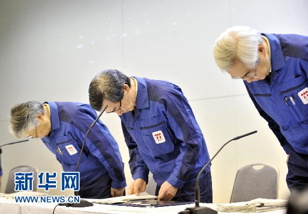 4月13日,在日本東京電力公司總部,東京電力公司社長清水正孝(中)及兩名副社長在新聞發(fā)布會上鞠躬致歉。當(dāng)日,東電在東京總部召開新聞發(fā)布會,社長清水正孝在發(fā)布會上就福島核危機(jī)向公眾致歉。 新華社/法新