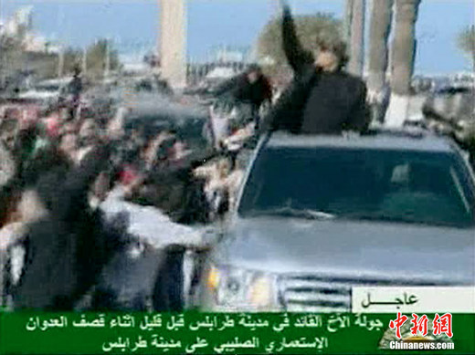 利比亞國(guó)家電視臺(tái)14日播放了卡扎菲當(dāng)天視察的黎波里并在街頭與支持者會(huì)面的視頻?ㄔ普驹谝惠v敞篷車(chē)上,身著休閑西裝,戴著墨鏡,揮舞拳頭,并和簇?fù)矶恋闹С终呶帐。電視臺(tái)稱,就在卡扎菲現(xiàn)身的同時(shí),北約戰(zhàn)機(jī)對(duì)的黎波里進(jìn)行了輪番轟炸。