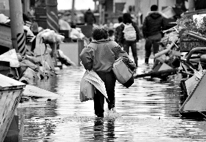 4月16日,日本宮城縣石卷市,一名婦女在水中行走。石卷市是此次地震的重災(zāi)區(qū),當(dāng)?shù)孛癖姷娜粘I钊晕椿謴?fù)。