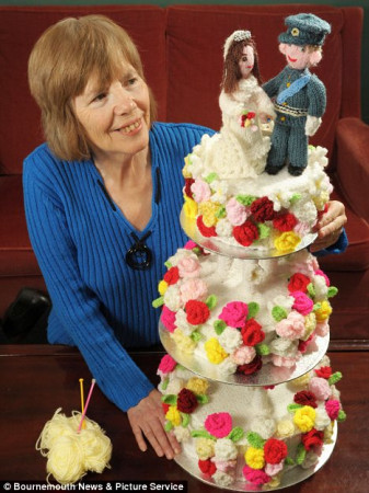 據(jù)英國《每日郵報》報道,英國南安普頓74歲老婦人花費(fèi)400多個小時,為威廉王子及其準(zhǔn)王妃“編織”了一個高三層的毛線結(jié)婚蛋糕,以表祝賀。