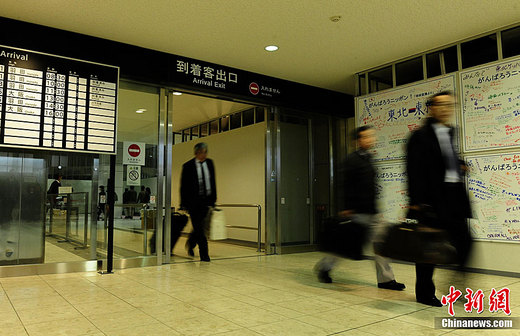 4月18日下午,剛剛抵達(dá)日本宮城縣仙臺(tái)機(jī)場(chǎng)的乘客走出到達(dá)大廳。據(jù)機(jī)場(chǎng)人士介紹,仙臺(tái)機(jī)場(chǎng)目前每天有日本航空和全日空航空兩家公司的6個(gè)航班往返仙臺(tái)與東京以及仙臺(tái)與大阪之間,而地震發(fā)生前該機(jī)場(chǎng)的航班數(shù)量每天約為50個(gè)。中新社發(fā) 侯宇 攝