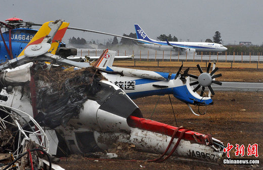 仙臺(tái)機(jī)場機(jī)庫前的停機(jī)坪上,10多架“缺胳膊斷腿”的直升機(jī)、小型飛機(jī)趴在地上,一片狼藉,很容易讓人誤以為是空難現(xiàn)場。機(jī)庫背后的場面更是讓人觸目驚心:數(shù)不過來的機(jī)場用行李車、擺渡車、舷梯車、廂式小貨車以及各類小汽車,被海嘯沖刷后擠壓在一起,有3個(gè)車廂上還清晰地印著中國國際航空公司的標(biāo)識(shí)。這處巨型汽車“墳場”邊,一株櫻花樹正含苞欲放,在這乍暖還寒、凄風(fēng)冷雨中透出春的氣息。