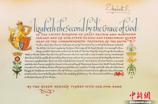 當?shù)貢r間4月21日,英國女王官方同意威廉王子迎娶凱特-米德爾頓的官方文書發(fā)布。這份由女王親筆簽署、用花體字謄抄的詳盡準許通告,正式宣布同意“我們最為至愛的皇孫威爾士王子、嘉德騎士威廉-亞瑟-菲利普-路易斯,和我們信任的深受喜愛的凱瑟琳-伊麗莎白-米德爾頓結(jié)為連理”。