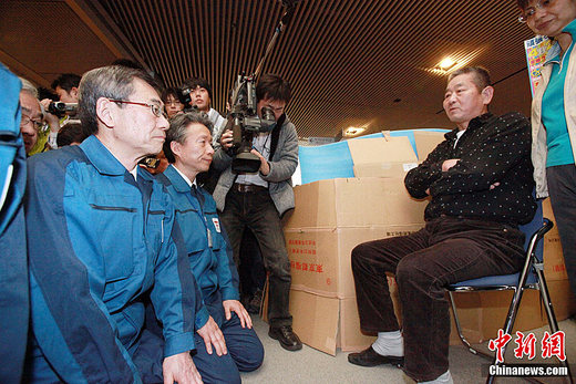 當(dāng)?shù)貢r(shí)間2011年4月22日,日本福島縣,東京電力社長(zhǎng)清水正孝到避難所向?yàn)?zāi)民跪地鞠躬謝罪,遭到災(zāi)民怒斥。