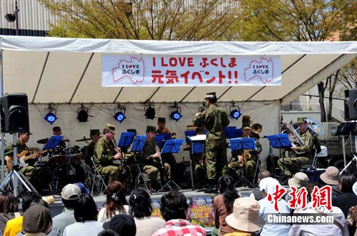 日本自衛(wèi)隊(duì)軍樂(lè)隊(duì)在福島街頭舉行“我愛(ài)福島”主題演奏會(huì)。中新社記者 孫自法 攝