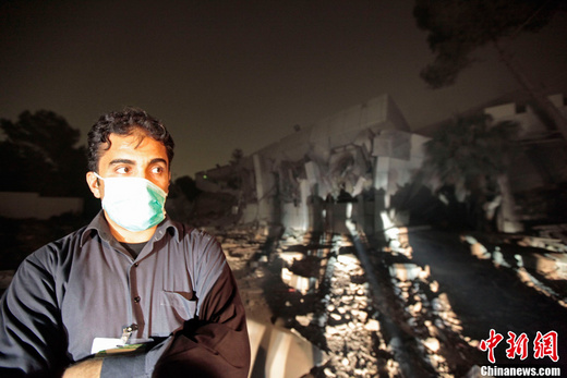 4月25日,在利比亞首都的黎波里,一名男子站在被轟炸的利比亞領(lǐng)導(dǎo)人卡扎菲的官邸前。北約戰(zhàn)機(jī)25日凌晨對利比亞領(lǐng)導(dǎo)人卡扎菲在的黎波里的官邸實施轟炸。利比亞政府官員譴責(zé)北約企圖殺害卡扎菲。