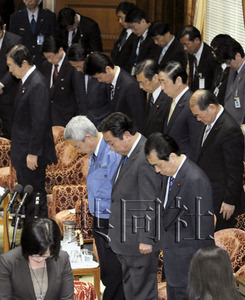 日本眾院預(yù)算委員會26日進(jìn)行大地震后的首次審議,全體與會者為震災(zāi)遇難者默哀。(共同社)