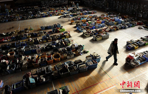 4月18日下午,一名日本人經(jīng)過(guò)設(shè)在宮城縣名取市一所小學(xué)校體育館里的受災(zāi)物品匯總處,這里匯集了附近搜尋到的影集、畢業(yè)證書(shū)、書(shū)包等物品,供災(zāi)民前來(lái)尋找。 中新社發(fā) 侯宇 攝