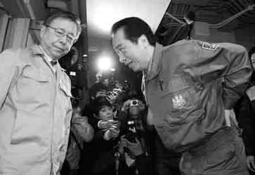 4月21日,菅直人首相(右)視察福島縣,向福島縣知事佐藤雄平鞠躬道歉。這張照片傳遍互聯(lián)網(wǎng)