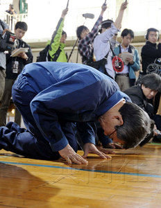 東電社長清水正孝4日下午前往二本松市體育館的安置點,向災(zāi)民下跪道歉。(共同社)