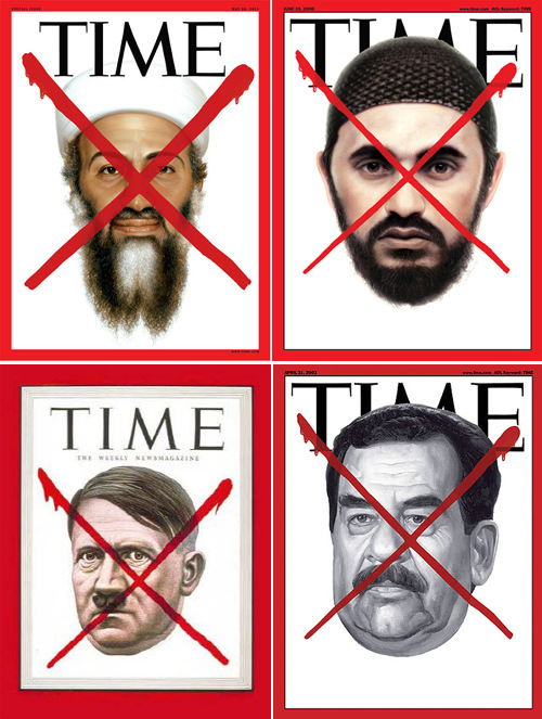 美國《時代》雜志在封面上給本·拉登、“911”恐怖襲擊主犯阿哈萊勒、希特勒、薩達姆(從左至右,從上至下)的頭像都畫上“紅叉叉”,寓意他們的死亡。
