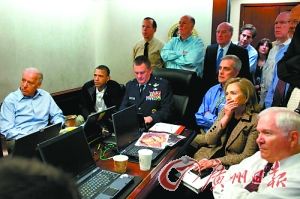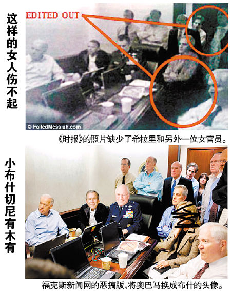 美國海豹突擊隊(duì)擊斃本·拉丹后,一張奧巴馬和幕僚在白宮時(shí)局室觀看“實(shí)時(shí)直播”的照片,成為定義這個(gè)重大時(shí)刻的里程碑式的照片。不過,美國一家猶太報(bào)紙?jiān)诳沁@張照片時(shí)卻動(dòng)了手腳,將希拉里和另一女官員去掉了。