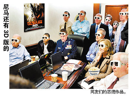 福克斯新聞網(wǎng)站的惡搞版是將奧巴馬換成美國前總統(tǒng)布什的頭像,將美國聯(lián)合特種作戰(zhàn)司令部司令韋伯換成前副總統(tǒng)切尼的形象,希拉里的頭像則被隨便用黑筆涂掉。