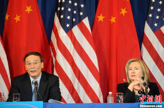 當(dāng)?shù)貢r(shí)間5月10日下午,第三輪中美戰(zhàn)略與經(jīng)濟(jì)對(duì)話閉幕,雙方共同簽署了“中美全面經(jīng)濟(jì)合作框架協(xié)議”。中國(guó)國(guó)務(wù)院副總理王岐山、國(guó)務(wù)委員戴秉國(guó)、美國(guó)國(guó)務(wù)卿克林頓、財(cái)長(zhǎng)蓋特納共同出席閉幕記者會(huì)。中新社發(fā) 張煒 攝