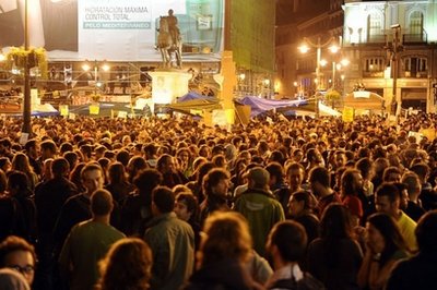據(jù)報(bào)道,西班牙的“真民主抗議組織”在社交網(wǎng)上呼吁舉行示威,得到回應(yīng),在西班牙首都馬德里市中心的太陽(yáng)門(mén)廣場(chǎng)(Puerta del Sol Square)上市,示威者們安營(yíng)扎寨,日以繼夜,抗議政府應(yīng)對(duì)經(jīng)濟(jì)危機(jī)不力,并誓言要待到本周日地方選舉開(kāi)始為止。