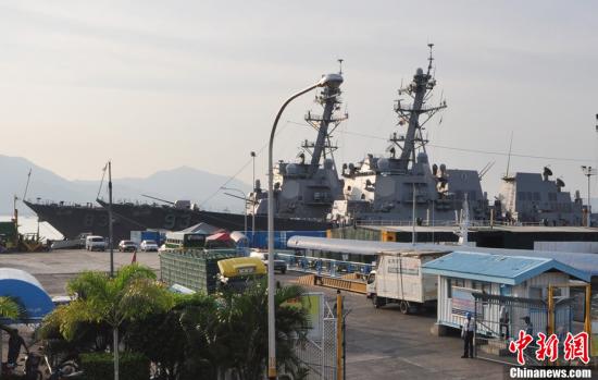 2011年6月28日,菲律賓和美國海軍2011年度“海上聯(lián)合戰(zhàn)備訓(xùn)練演習(xí)”CARAT在菲律賓西南部巴拉望省省會(huì)普林塞薩港市開幕。圖為?吭诟劭诘拿绹\妼(dǎo)彈驅(qū)逐艦“鐘云”號(hào)(93)和“霍華德”號(hào)(83)。中新社發(fā) ERIC 攝