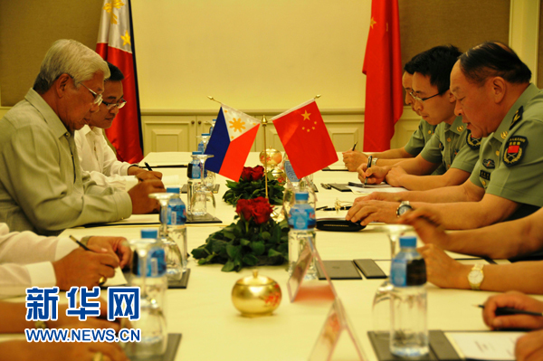 5月28日,中國國務委員兼國防部長梁光烈上將(右一)與菲律賓國防部長加斯明(左一)在柬埔寨首都金邊舉行會談。國務委員兼國防部長梁光烈上將當日在金邊應約會見了正在柬埔寨參加東盟防長會的菲律賓國防部長加斯明,雙方就雙邊關系及共同關心的問題交換了意見。新華社發(fā)(塔納克儂攝)