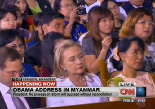 當天,坐在希拉里身旁聽奧巴馬演講的是緬甸全國民主聯(lián)盟領(lǐng)導人昂山素季。