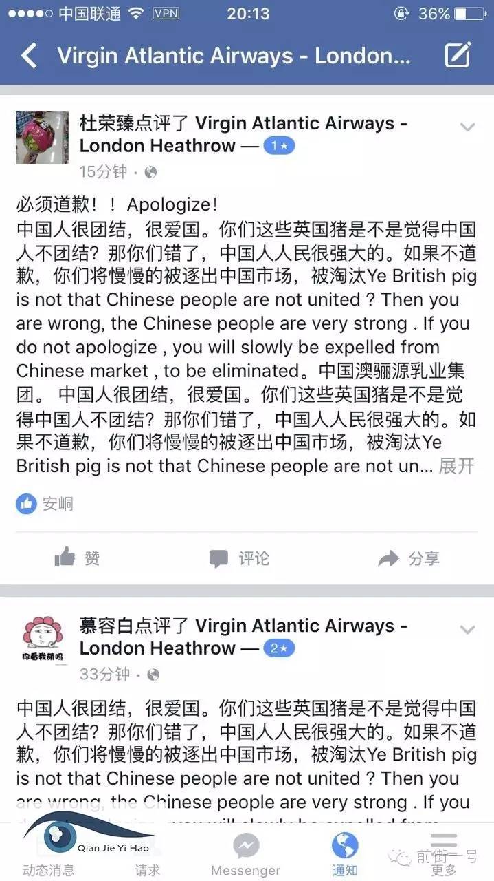 3月18日晚7點(diǎn),數(shù)千名“帝吧網(wǎng)友”同時(shí)在線向維珍航空f(shuō)b主頁(yè)發(fā)起進(jìn)攻,而此次事件的導(dǎo)火索就是一名中國(guó)乘客在維珍航空的飛機(jī)上被一名外籍男子侮辱為“中國(guó)豬”。