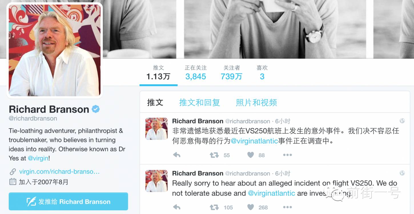 事后維珍航空創(chuàng)始人理查德·布蘭森 (Richard Branson) 也在自己的 Twitter 賬號(hào)上用英文和中文公開(kāi)致歉并稱會(huì)持續(xù)調(diào)查該事件。