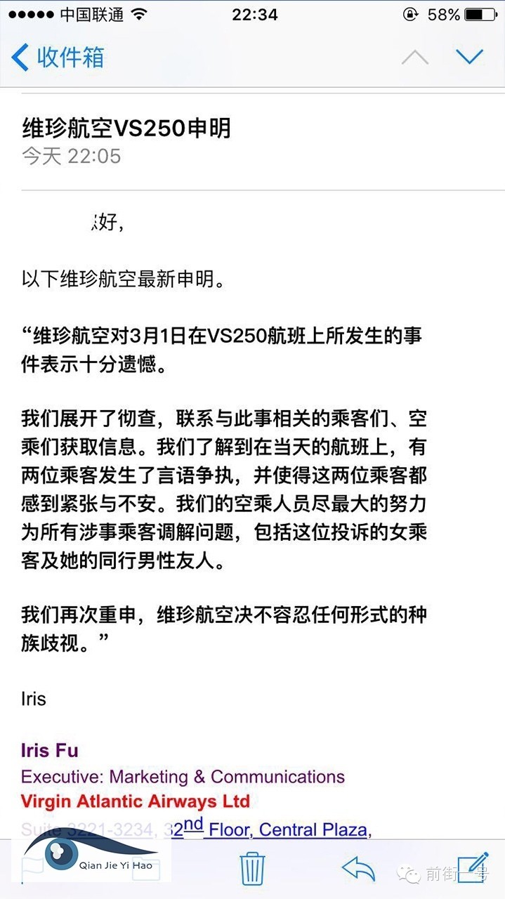 截止到3月18日晚10點(diǎn),維珍航空公司仍未就此事公開(kāi)發(fā)表聲明或致歉等信息,但維珍航空公司fb主頁(yè)面被刷屏仍在繼續(xù)。而就在這個(gè)時(shí)間,維珍航空公司給前街一號(hào)記者發(fā)來(lái)郵件,全文如下