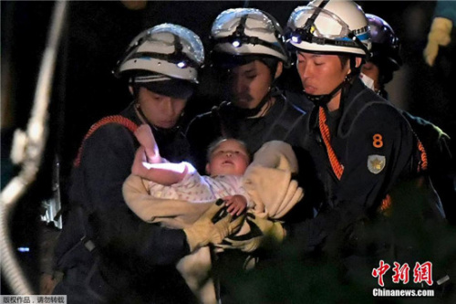 其中一棟2層木造民房的1樓部分也毀于一旦。當(dāng)時(shí)正在臥室與母親睡在一起的女嬰被困其中,消防人員和自衛(wèi)隊(duì)員在房頂上鉆孔,從而進(jìn)到屋內(nèi)展開救援。雖然持續(xù)不斷的余震干擾著救援工作,但凌晨3點(diǎn)45分左右,終于確認(rèn)到女童平安無事。