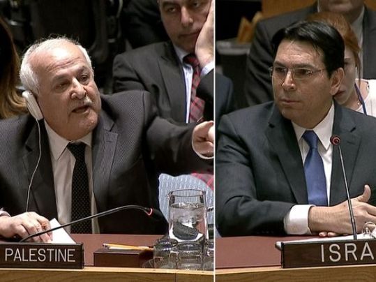 安理會當天舉行中東問題會議,以色列常駐聯(lián)合國代表丹尼·達農(nóng)與巴勒斯坦常駐聯(lián)合國觀察員里亞德·曼蘇爾在會上火力全開,互不相讓。